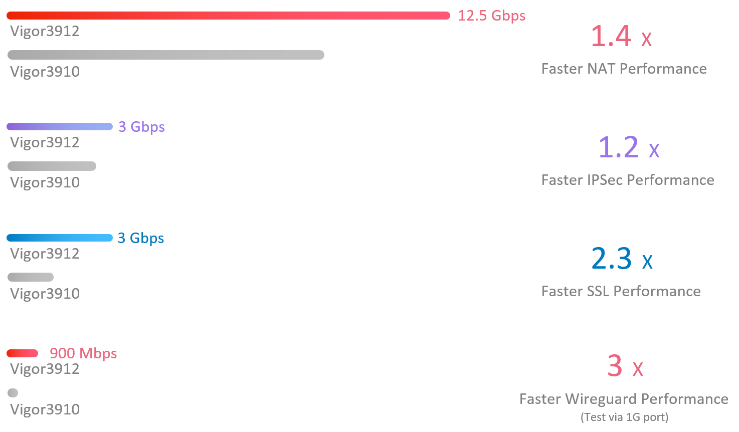 El Vigor3912 está diseñado para trabajar en entornos exigentes con altos anchos de banda. El router cuenta con un potente procesador de cuatro núcleos, ocho interfaces WAN, incluyendo dos SFP+ de 10G para la conectividad de fibra, dos Ethernet de 2,5G, RJ-45, y cuatro Gigabit Ethernet, RJ-45, le da un rendimiento NAT de hasta 9 Gbps.